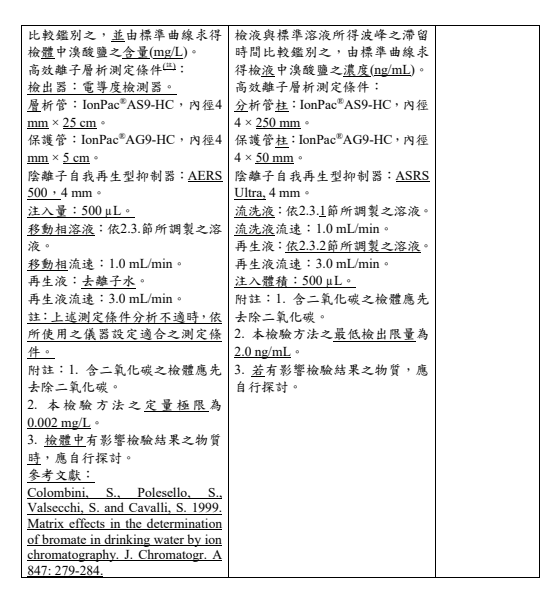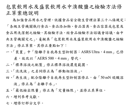 2022年5月23日,臺(tái)灣衛(wèi)福部食藥署發(fā)布衛(wèi)授食字第1111900735號(hào)公告,預(yù)告修正「包裝飲用水及盛裝飲用水中溴酸鹽之檢驗(yàn)方法」草案。 其修正要點(diǎn)如下: